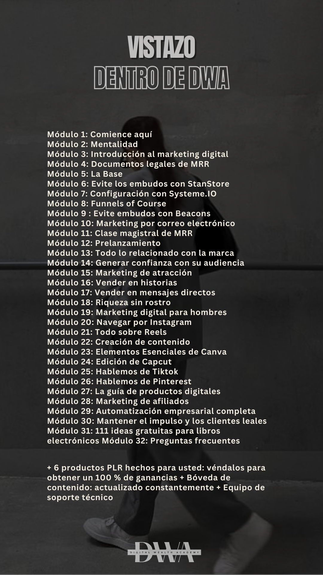 Curso de Marketing Digital - Digital Wealth Academy con más de 100 videos didácticos (los 31 módulos descritos arriba).